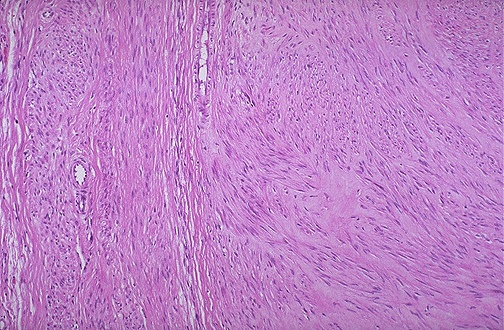 | Here is the microscopic appearance of a benign leiomyoma. Normal myometrium is at the left, and the neoplasm is well-differentiated so that the leiomyoma at the right hardly appears different. Bundles of smooth muscle are interlacing in the tumor mass. |