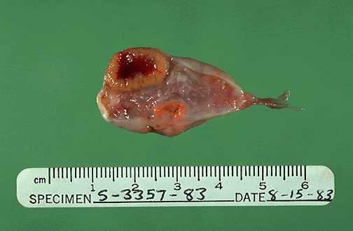 | This is an adult ovary with two corpora lutea. The larger one at the top is a hemorrhagic corpus luteum of menstruation, and the smaller one at the bottom is involuting from a previous menstrual period. If implantation of a fertilized ovum occurs, then the corpus luteum will persist because of HCG from the placenta. Of 400,000 ovarian follicles present at birth, only about 400 will mature to the point of ovulation during childbearing years. |