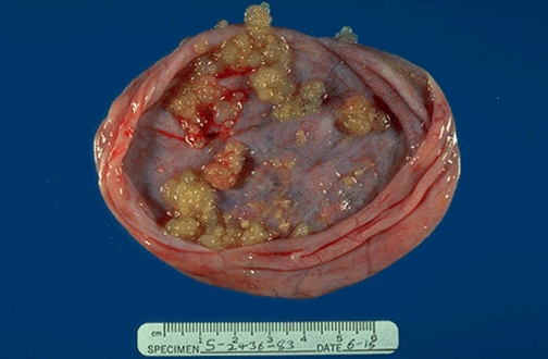 | This is a papillary serous cystadenocarcinoma. Note the many papillations on the inner surface. In classification schemes between benign cystadenomas and malignant cystadenocarcinomas lies the grey zone of "borderline" lesions that are not clearly malignant, but are treated as though they could be. |