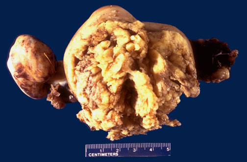 | This adenocarcinoma of the endometrium is more obvious. Irregular masses of white tumor are seen occupying most of the interior of this uterus that has been opened anteriorly. The cervix is at the bottom of the picture. This enlarged uterus was no doubt palpable on physical examination. Such a neoplasm may often present with abnormal bleeding. |