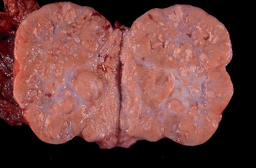 | This is an ovarian dysgerminoma that has been sectioned into two halves. Note the pale brown appearance of the parenchyma, along with some central collagenous scar. The gross and microscopic appearance of an ovarian dysgerminoma is essentially the same as a seminoma of the testis in a male. |