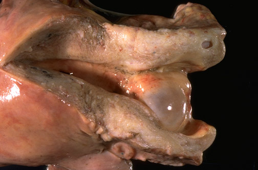 | Seen here is a large translucent nabothian cyst in the outer endocervical canal. Inflammation may produce submucosal gland obstruction so that glandular cystic dilation occurs. The cyst is filled with a clear, mucoid fluid. These are common lesions, generally from a few millimeters to 1 cm in size. |