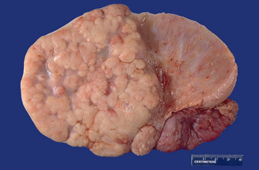 | This is another ovarian dysgerminoma that on sectioning reveals a lobulated tan appearance. Some normal edematous light brown ovarian tissue is present at the right. Such tumors are usually solid. Only 10 to 20% are bilateral. They occur most often in young women. |