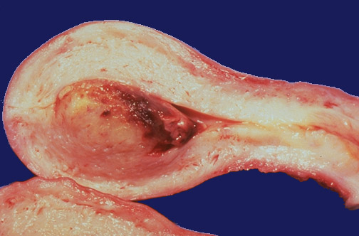 | The mass shown here is a placental site trophoblastic tumor. This rare lesion is composed of a mass of deeply invasive intermediate trophoblast. Despite the invasion, most of these lesions are self-limited and can be removed by curretage, though a few are malignant and can metastasize. |