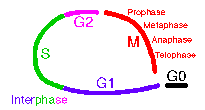 | This is a diagrammatic representation of the normal somatic cell cycle. Cells that are not actively dividing, or are no longer capable of division, are in G0. When somatic cells are mitotically active, they spend most of the ccell cycle in interphase, preparing for mitosis. The stages of the cycle are as follows: |