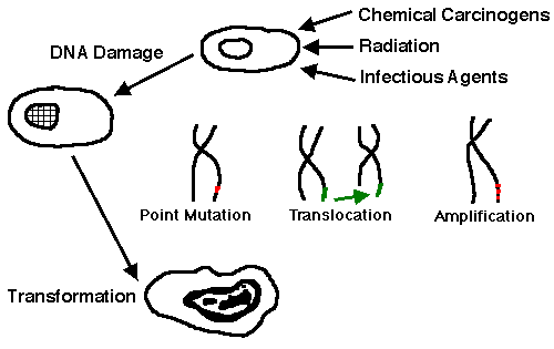 Genetic damage with DNA alterations leads to point mutations of genes, translocations of genetic material between chromosomes, and gene reduplication with amplification. These alterations transform proto-oncogenes into oncogenes. The proto-oncogenes may play a role in growth promotion and regulation in normal cells, perhaps in embryogenesis, but are typically "turned off" in adults. They are "turned on" by transformation. Likwise, mutations may render tumor suppressor genes inactive, leading to loss of cell growth control. The fundamental concept of neoplasia is that the neoplasm arises from a single clone of cells, so that neoplasms are monoclonal. The classic experiment that proved this was the demonstration of two glucose 6 phosphate dehydrogenase (G6PD) alleles in normal cells on an individual and only a single allele in a neoplasm in that individual. Cellular growth can be compared to driving an automobile: you have an accelerator to increase speed (growth), you have a brake to decrease speed (growth), and you have gas in the tank to keep going (growing).