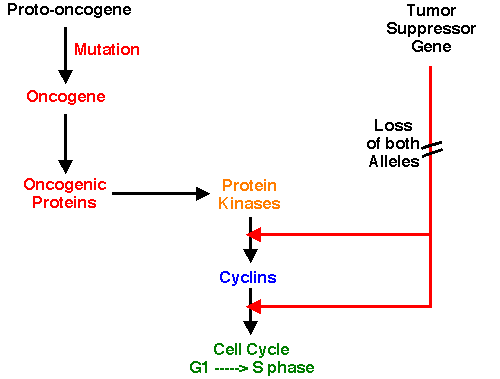 Neoplasia and GeneticsMany neoplasms may be directly linked to genetic abnormalities. Most of the genetic alterations in human neoplasms are acquired somatic cell mutations, while a minority are linked to inherited genetic problems. A neoplasm is an uncontrolled growth of cells, leading to a mass (tumor). If the process is indolent and the mass remains localized, then a benign neoplasm is the result. If the neoplasm acts in a more aggressive fashion, then it is called malignant. Neoplasms are the result of the loss of control of cell growth. There are a host of complex genetic controls on cellular growth. Some of these genetic factors are most important during embryogenesis and are then turned off. Other continue through life. Control is often achieved via activation or suppression of protein kinases. The diagram below illustrates how genetic alterations may occur: