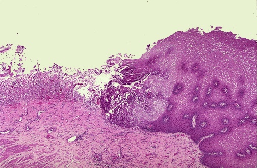 | A herpetic ulcer is seen microscopically to have a sharp margin. The ulcer base at the left shows loss of overlying squamous epithelium with only necrotic debris remaining. In the upper GI endoscopic view below, there are rounded, erythematous ulcerations of the lower esophagus. Biopsies of these lesions reveals intranuclear inclusions in squamous epithelial cells indicative of herpes simplex virus esophagitis. This patient was immune compromised from chemotherapy. |