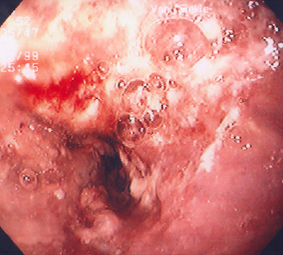A history of smoking and/or alcoholism is often present in patients with esophageal squamous carcinoma, while a history of Barrett esophagus precedes development of esophageal adenocarcinoma in many cases. Above, an ill-defined mass at the gastroesophageal junction produces mucosal ulceration and irregularity, which led to the clinical symptoms of pain and difficulty swallowing. The mucosal irregularity is shown in the upper GI endoscopy view in the image below. |