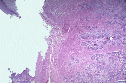| At the upper left is a remnant of squamous esophageal mucosa that has been undermined by an infiltrating squamous cell carcinoma of the mid-esophagus. Solid nests of neoplastic cells are infiltrating down through the submucosa at the right. Esophageal cancers often spread to surrounding structures, making surgical removal difficult. |