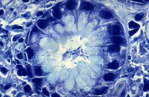 | Chronic gastritis and peptic ulcer disease are often accompanied by infection with Helicobacter pylori. This small curved to spiral rod-shaped bacterium is found in the surface epithelial mucus of most patients with active gastritis. The rods are seen here with a methylene blue stain. |