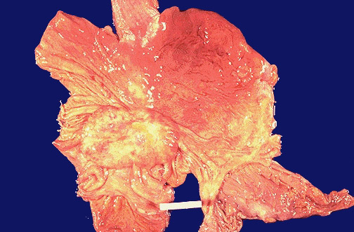 ![]() | Gastric neoplasia is not uncommon. Here is a gastric adenocarcinoma In the U.S., most gastric cancers are discovered at a late stage when the neoplasm has invaded and/or metastasized. ALL gastric ulcers and ALL gastric masses must be biopsied, because it is not possible to tell from gross appearance alone which are benign and which are malignant. In contrast, virtually all duodenal peptic ulcers are benign. |