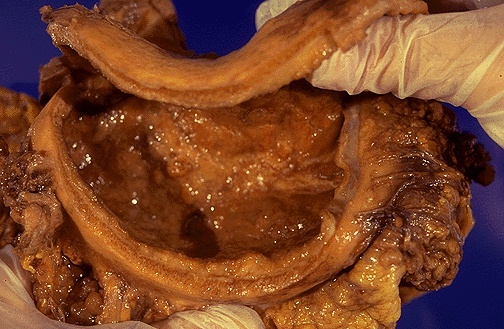 ![]() | This is an example of linitis plastica, a form of diffuse infiltrative gastric adenocarcinoma which gives the stomach a shrunken "leather bottle" appearance with extensive mucosal erosion and a markedly thickened gastric wall. This type of carcinoma has a very poor prognosis. The endoscopic view of this lesion is shown below, with extensive mucosal erosion. |