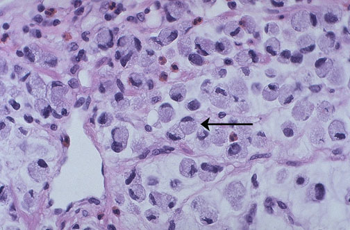 | This is a signet ring cell pattern of adenocarcinoma in which the neoplastic cells are filled with cytoplasmic mucin vacuoles that compress the nucleus to one side, as shown at the arrow. Signet ring cell adenocarcinomas are poorly differentiated and tend to be highly invasive. |