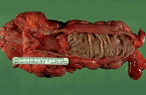 ![]() | An encircling adenocarcinoma of the rectosigmoid region is seen here. There is a heaped up margin of tumor at each side with a central area of ulceration. This produces the bleeding that allows detection through a stool guaiac test. Normal mucosa appears at the right. The tumor encircles the colon and infiltrates into the wall. Staging is based upon the degree of invasion into and through the wall. The colonoscopic views of a smaller rectal adenocarcinoma, but still with an ulcerated surface, are shown below. |