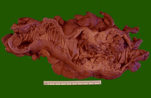 ![]() | Here is another example of an adenocarcinoma of colon. This cancer is more exophytic in its growth pattern. Thus, one of the complications of a carcinoma is obstruction (usually partial). Colonoscopic views of another ulcerating mass, a rectal adenocarcinoma, are seen below. |