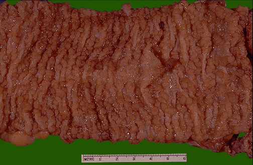 | This is familial polyposis coli. The mucosal surface of the colon is essentially a carpet of small adenomatous polyps. Of course, even though they are small now, there is a 100% risk over time for development of adenocarcinoma, so a total colectomy is done, generally before age 20. Patients with this disorder inherit a faulty adenomatous polyposis coli (APC) gene. |