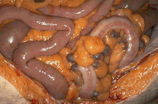 ![]() | The sigmoid colon at the right appears lighter in color than the adjacent small intestine and has a band of taenia coli muscle running longitudinally. Protruding from the sigmoid colon are multiple rounded bluish-gray diverticula. Diverticula are much more common in the colon than in small intestine, and they are more common in the left colon, and they are more common in persons living in developed nations in which the usual diet has less fiber. |