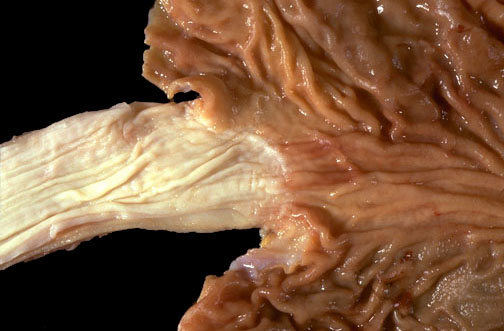 | This is a normal esophagus with the usual white to tan smooth mucosa seen at the left. The gastroesophageal junction (not an anatomic sphincter) is at the center, and the stomach is at the right. The upper GI endoscopic view of the transition from tan squamous mucosa to pink columnar mucosa is seen below. |