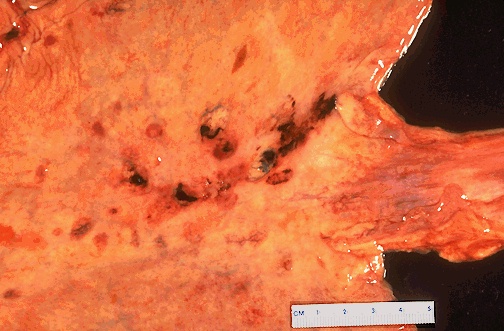 | Here are some larger areas of gastric hemorrhage that could best be termed "erosions" because the superficial mucosa is eroded away. Such erosions are typical for the pathologic process termed gastropathy, which describes gastric mucosal injury without significant inflammation. The findings here fit with acute erosive gastropathy, but there are other patterns. Etiologies for the various gastropathies can include: alcohol, drugs such as NSAIDS, stress, uremia, bile reflux, portal hypertension, radiation, and chemotherapy. |