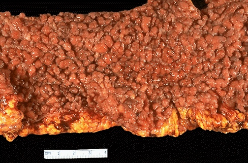 | Here is another example of polyposis with numerous small polyps covering the colonic mucosa. In this particular case, there were osteomas of the skull, a periampullary adenocarcinoma, and epidermal inclusion cysts. Thus, this is a case of Plenk-Gardner syndrome. As with familial adenomatous polyposis, the inheritance pattern is autosomal dominant, with a faulty adenomatous polyposis coli (APC) gene. |