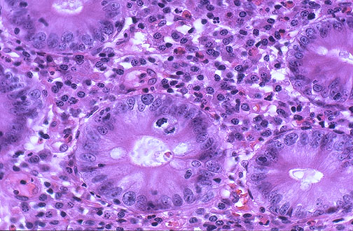 | The small intestinal mucosa at high magnification shows marked chronic inflammation in a case of celiac sprue. There is sensitivity to gluten, which contains the protein gliaden, found in cereal grains wheat, oats, barley, and rye. Removing foods containing these grains from the diet will cause this gluten-sensitive enteropathy to subside. The enteropathy shown here has loss of crypts, increased mitotic activity, loss of brush border, and infiltration with lymphocytes and plasma cells (B-cells sensitized to gliaden). |