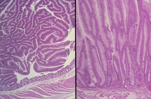 | Microscopically, a villous adenoma is shown at its edge on the left, and projecting above the basement membrane at the right. The cauliflower-like appearance is due to the elongated glandular structures covered by dysplastic epithelium. Though villous adenomas are less common than adenomatous polyps, they are much more likely to harbour invasive carcinoma in them (about 40% of villous adenomas). |