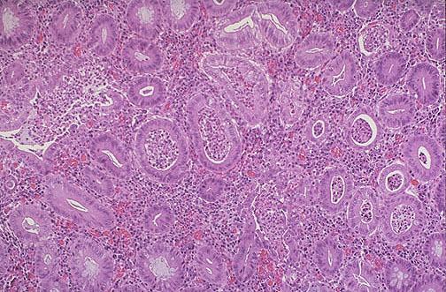 | The colonic mucosa of active ulcerative colitis shows "crypt abscesses" in which a neutrophilic exudate is found in glandular lumens of crypts of Lieberkuhn. The submucosa shows intense inflammation. The glands demonstrate loss of goblet cells and hyperchromatic nuclei with inflammatory atypia. |