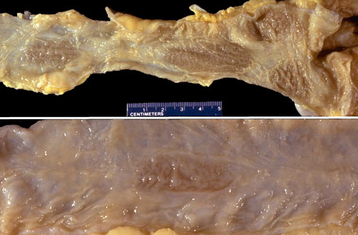 | This is the normal appearance of terminal ileum. In the upper frame, note the ileocecal valve, and several darker oval Peyer's patches are present on the mucosa. In the lower frame, a Peyer's patch, which is a concentration of submucosal lymphoid tissue, is present. Note the folds are not as prominent here as in the jejunum, as evidenced by the colonoscopic view below. |