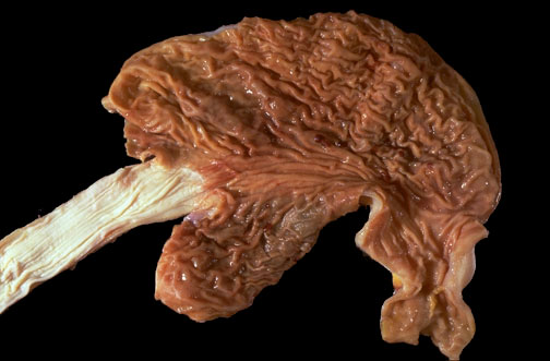 ![]() | The esophagus is at the left. The stomach has been opened along the greater curvature to reveal a normal fundus. In the fundus can be seen the lesser curvature. Just beyond the antrum is the pylorus emptying into the first portion of duodenum is at the lower right. The normal appearance of the gastric fundus on upper GI endoscopy is shown below at the left, with the normal duodenal appearance at the right. |