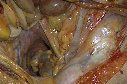 | This view of the lower pelvis demonstrates bowel extending into a hernia in the inguinal region. Since the bowel is not easily reducible from this location, the bowel is said to be "incarcerated" in the hernia, but the bowel is not "strangulated" because it has not become ischemic from a compromised blood supply. |