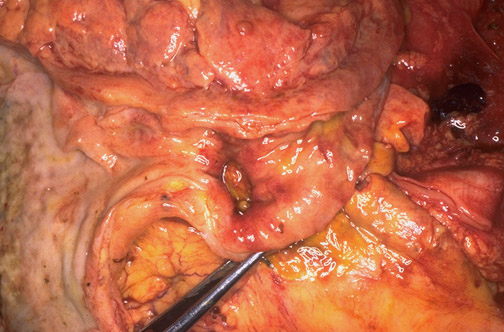 ![]() | The strongest association with Helicobacter pylori is with duodenal peptic ulceration--over 85% of duodenal ulcers. Seen here is a penetrating acute ulceration in the duodenum just beyond the pylorus. An acute duodenal ulcer is seen in two views on upper endoscopy in the panels below. |