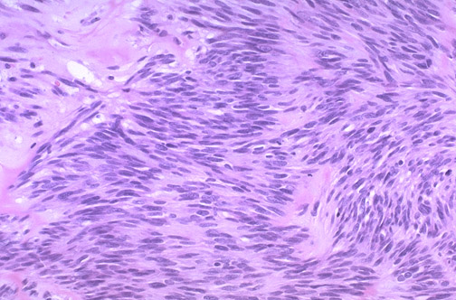 | The bundles of spindle cells are typical for a gastrointestinal stromal tumor (GIST). The biologic potential of these tumors is notoriously difficult to evaluate. The most important features are mitotic count, size, and cellularity. This tumor, because of its large size and increased cellularity, but relative lack of mitotic activity, has been classified as a stromal tumor of uncertain malignant potential, or STUMP. |