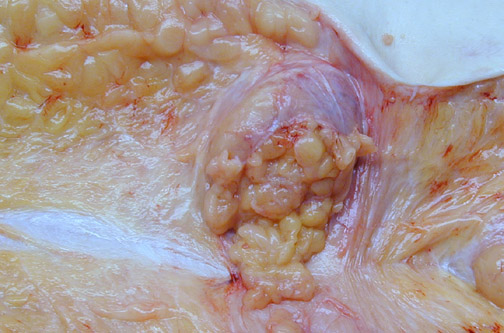 | It is not exciting but it is common--a hernia. Hernias represent an outpouching of peritoneum through a defect or weakness in the abdominal wall. This is most typical in the inguinal region, but it can also occur in the umbilical region, as seen here. An "internal" herniation of bowel can result from an abnormal opening formed by adhesions, as in the previous image. The defect may be large enough to admit omentum or bowel. In this abdominal incision can be seen a small hernia sac that contains adipose tissue from omentum. The external appearance of the umbilical hernia is seen below. |