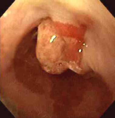 | This is the view of the lower esophagus seen on endoscopy. Note the areas of dark red friable mucosa representing Barrett esophagus. Note the polypoid mass which on biopsy proved to be a moderately differentiated adenocarcinoma. This patient had a 30 year history of poorly controlled gastroesophageal reflux disease. |