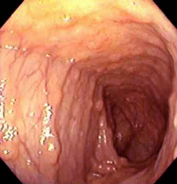 | In the colonoscopic view above in small intestine above can be seen multiple small polyps. These proved to be hamartomatous polyps on biopsy, consistent with Peutz-Jehgers syndrome, a rare autosomal dominant condition that can be associated with polyps anywhere in the GI tract. Persons with this syndrome have an increased risk for developing malignant neoplasms in various organs, but not directly within the polyps. On upper endoscopy, duodenal polyps are seen below. |