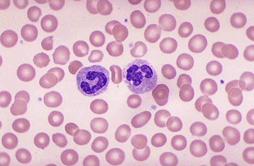 | The red blood cells here are normal, happy RBC's. They have a zone of central pallor about 1/3 the size of the RBC. The RBC's demonstrate minimal variation in size (anisocytosis) and shape (poikilocytosis). A few small fuzzy blue platelets are seen. In the center of the field are a band neutrophil on the left and a segmented neutrophil on the right. |