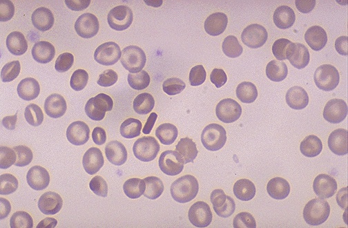 | This patient has hemoglobin SC disease, with hemoglobin S and hemoglobin C both present. With SC disease, the RBC's may sickle, but not as commonly as with Hemoglobin SS disease. The hemoglobin C leads to the formation of "target" cells--RBC's that have a central reddish dot. In the center of the field is a rectangular RBC that is indicative of a hemoglobin C crystal, which is also characteristic for hemoglobin C disease. |