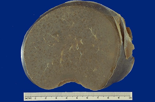 | This enlarged spleen has the appearance and feel of wax. This is amyloidosis of the spleen, which can have either the diffuse "lardaceous" pattern seen here, or the nodular "sago" pattern. This amyloid proved to be of the AL type and the patient had multiple myeloma. |