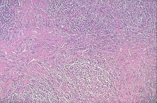 | At medium power, nodular sclerosing Hodgkin lymphoma has prominent bands of fibrosis. Staging of Hodgkin lymphoma is important to try and determine therapy and the prognosis. Staging is often done by radiographic means, with CT scans used to determine where lymphadenopathy is located, ultrasonography to determine size and lesions of liver and spleen, and chest radiograph. Histologic diagnosis is typically made from biopsy of an involved lymph node. A bone marrow biopsy is typically performed as well. Staging laparotomy is less commonly used nowadays because the radiographic procedures are excellent. |
