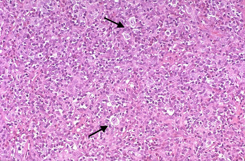 At high power, there are scattered large cells with a surrounding prominent clear space, an artefact of formalin fixation. These are the lacunar cells characteristic for the nodular sclerosis type of Hodgkin lymphoma.