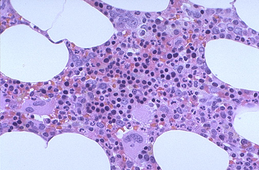 | This is the appearance of normal bone marrow at high magnification. Note the presence of megakaryocytes, erythroid islands, and granulocytic precursors. This marrow is taken from the posterior iliac crest in a middle aged person, so it is about 50% cellular, with steatocytes admixed with the marrow elements. |