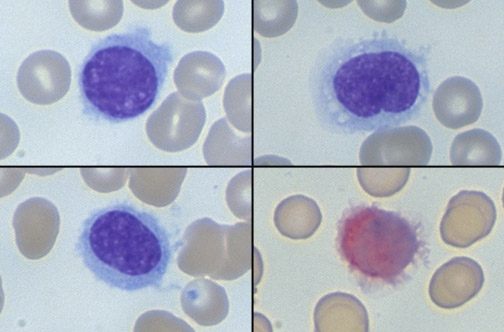 ![]() | This collage of cells on peripheral blood smears depicts abnormal lymphocytes with indistinct cytoplasmic borders and projections, giving the cells a "hairy" appearance. At the lower right can be seen one of these cells with red cytoplasmic staining indicative of tartrate resistant acid phosphatase (TRAP) positivity. This is hairy cell leukemia, an uncommon B cell proliferation seen mostly in older males and marked by marrow involvement, pancytopenia, and splenomegaly. |