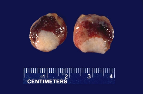 | The tan-white nodules in these anthracotic hilar lymph nodes are metastases from a bronchogenic carcinoma. Lymph node metastases are more likely to occur in lymph nodes draining an organ or body region with the primary neoplasm. Carcinomas are more likely to metastasize to lymph nodes than sarcomas. |