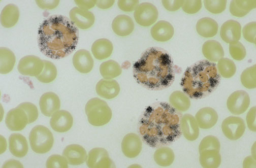 | The nitroblue tetrazolium (NBT) slide test is used for screening defects in NADPH oxidase. In this test, patient neutrophils are exposed to a stimulus, incubated with NBT, and made into a smear on a slide. Under the microscope, the number of neutrophils with dark granules of reaction product are counted. Normally, more than 95% of the granulocytes will be positive as shown above. In chronic granulomatous disease (CGD) there is an absent or reduced function of the respiratory burst, which is the intracellular process in neutrophils that is dependent upon the enzyme NADPH oxidase, which produces oxygen free radicals used to kill phagocytized organisms. The abnormal NBT test in CGD is shown below in which <5% of neutrophils stain. |