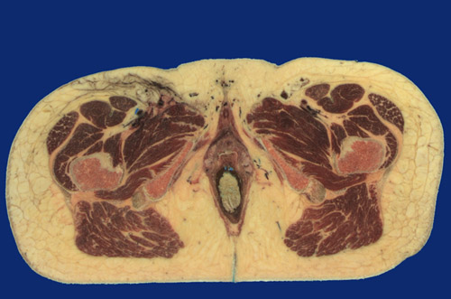 | Identify the following regions in the image above: Ischiocavernosus m. - Bulbospongiosus m. - Crus of clitoris - Vagina - Urethra - Bulb of vestibule (corpus spongiosum) - Great saphenous vein - Femoral artery & vein - Sartorius - Rectus femoris - Vastus intermedius - Tensor fasciae latae - Vastus lateralis - Quadratus femoris - Gluteus maximus - Adductor magnus - Femur - Ischium - Ischioanal fossa - Rectum - Levator ani |