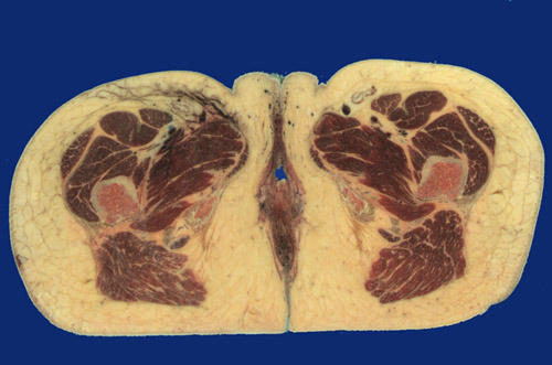 | Identify the following regions in the image above: Labia majora - Vestibule - Bulbospongiosus m. - Corpora cavernosa of clitoris - Great saphenous vein - Femoral artery & vein - Adductor longus - Adductor brevis - Adductor magnus - Vastus intermedius - Tensor fasciae latae - Vastus lateralis - Quadratus femoris - Gluteus maximus - Gracilis - Ischium - Femur - Anus - External anal sphincter |