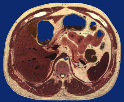 | Identify the following regions in the image above: Rectus abdominus - External oblique - Latissimus dorsi - Serratus posterior inferior - Sacrospinalis - Multifidus - Body of stomach - Pylorus - Duodenal bulb - Colonic splenic flexure - Colonic hepatic flexure - Jejunum - Pancreas - Spleen - Diaphragm - Descending aorta - Inferior vena cava - Left adrenal gland - Right adrenal gland - Gallbladder - Liver - Vertebral body - Spinal cord |