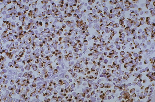 CAM 5,2 is an antibody with specificity for cytokeratins 8 and 18. It is shown here with positive staining of a Merkel cell carcinoma of the skin at high power.