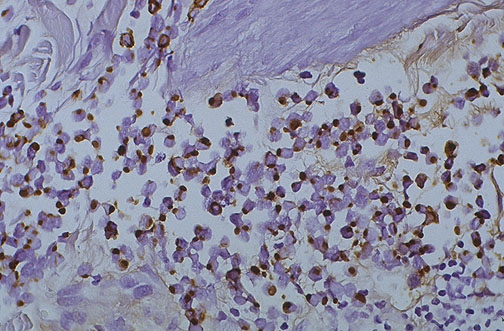 This is an AE-1 positive Merkel cell carcinoma of skin at high power. AE-1 is a cytokeratin marker for carcinomas.